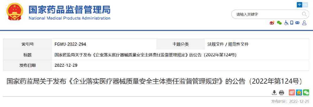2022年12月29日,國家藥品監(jiān)督管理局發(fā)布《企業(yè)落實醫(yī)療器械質(zhì)量安全主體責(zé)任...